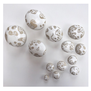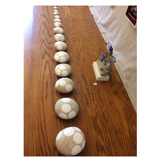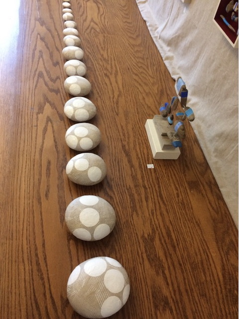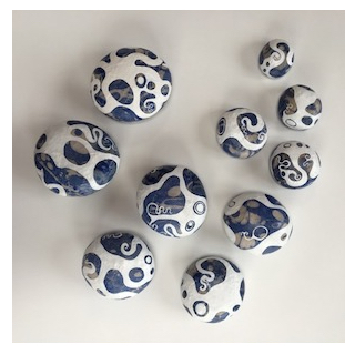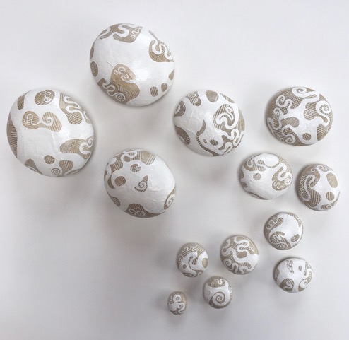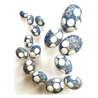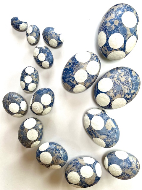 Slither II beach stones, marble paper, acrylic paint, 4' long or various shapes, 2019
