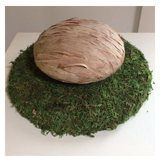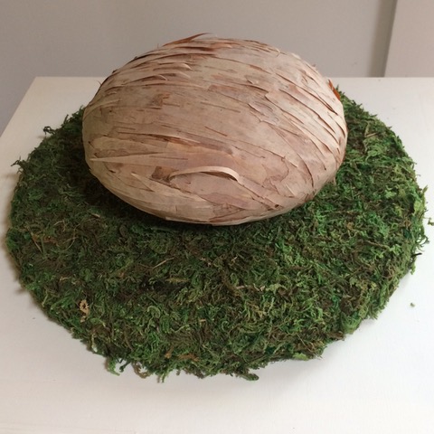 Imposter beach rock, birchbark paper, moss, 5" x 8" round, 2018