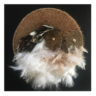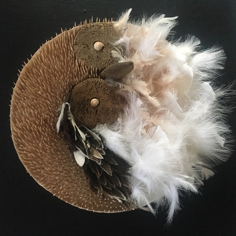 Scruffy Owl found materials, feathers, toothpicks, 22” round x 4”, 2020