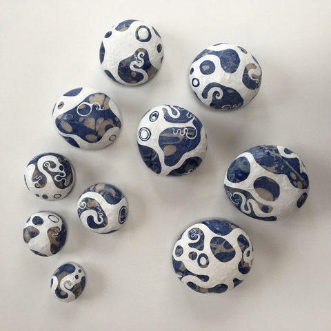Slither I beach rocks, marble paper, acrylic paint, 5' long or various shapes, 2019